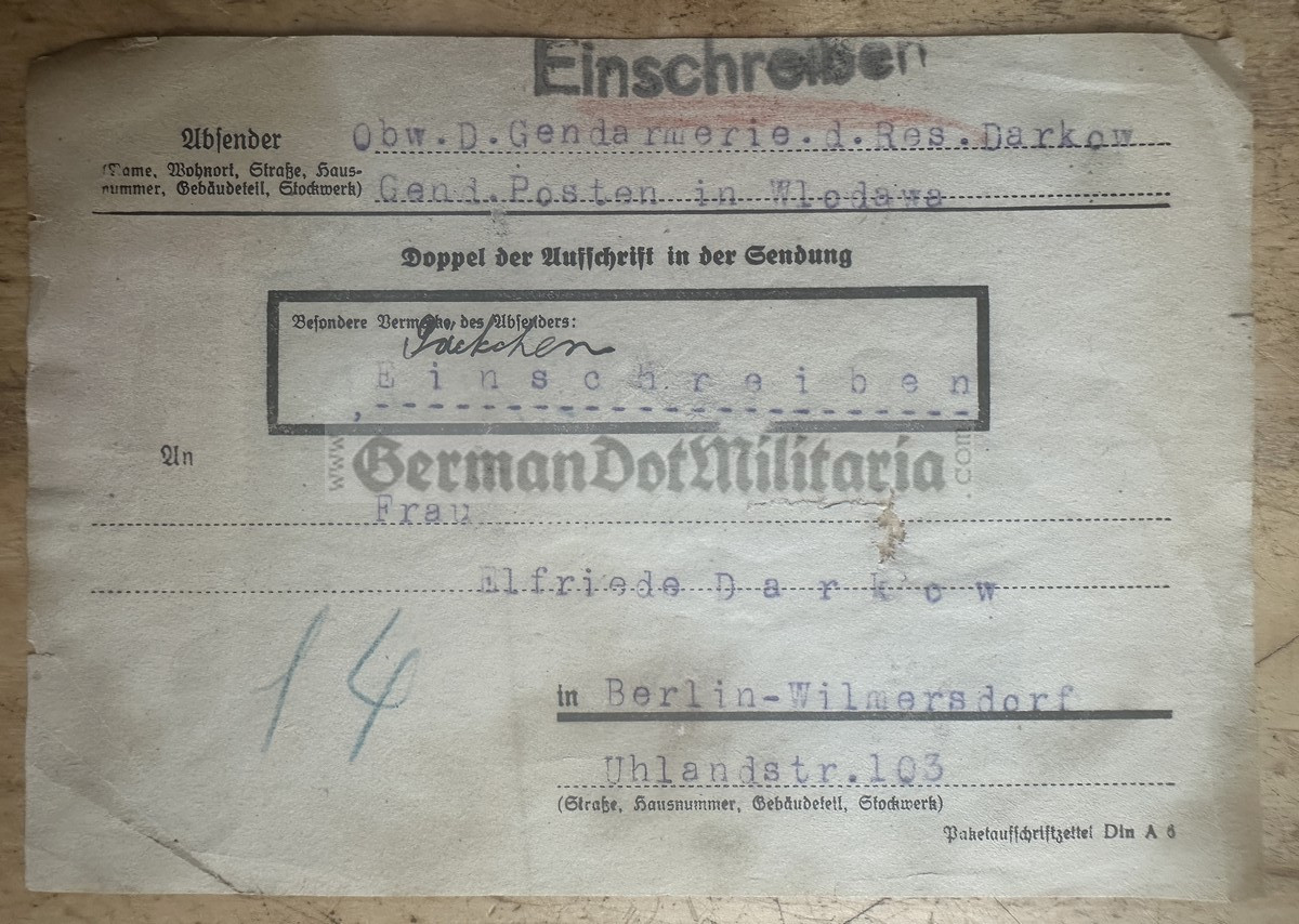 ac470 - German Gendarmerie Police Officer in occupied Poland - receipt of registered parcel sent to his wife in Berlin