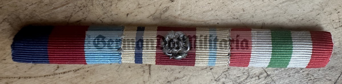 • The ribbons represent the 1939-1945 Star, the Atlantic Star (indicated by the rosette), the Italy Star, and the War Medal 1939-1945.