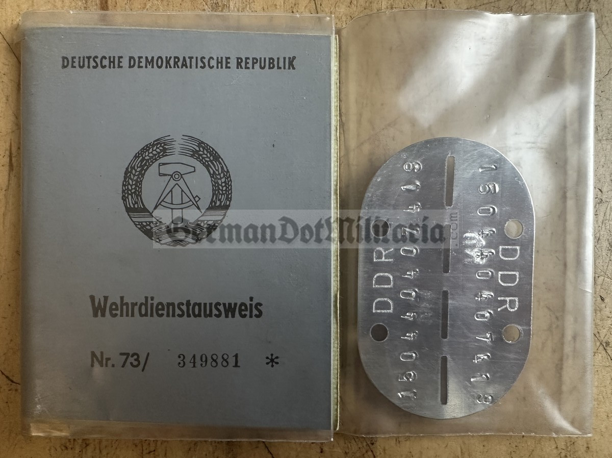 ac673 - NVA WDA Wehrdienstausweis document with dog tag - c1974 Strausberg