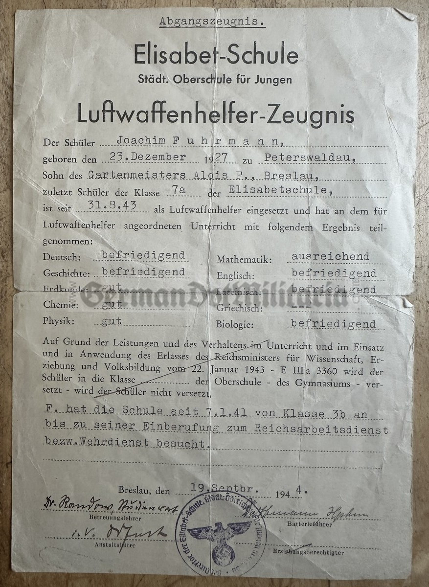 ac693 - c1944 Luftwaffenhelfer Zeugnis - school leaving cert for a helper of the Luftwaffe - from Breslau in Poland