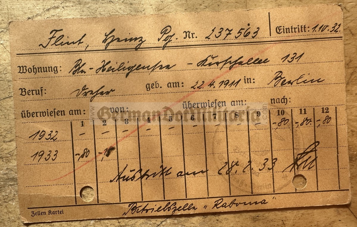 ac915 - c1932 NSDAP membership dues card - Betriebszelle in Berlin Heiligendamm - left the party in February 1933