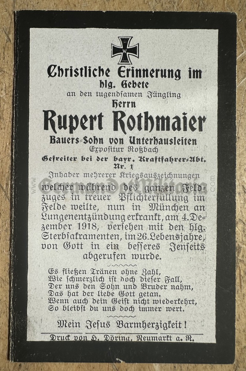 dc005 - c1918 German WW1 death card - Bavarian lorry driver Abteilung 1 - died of pneumonia - Rupert Rothmaier
