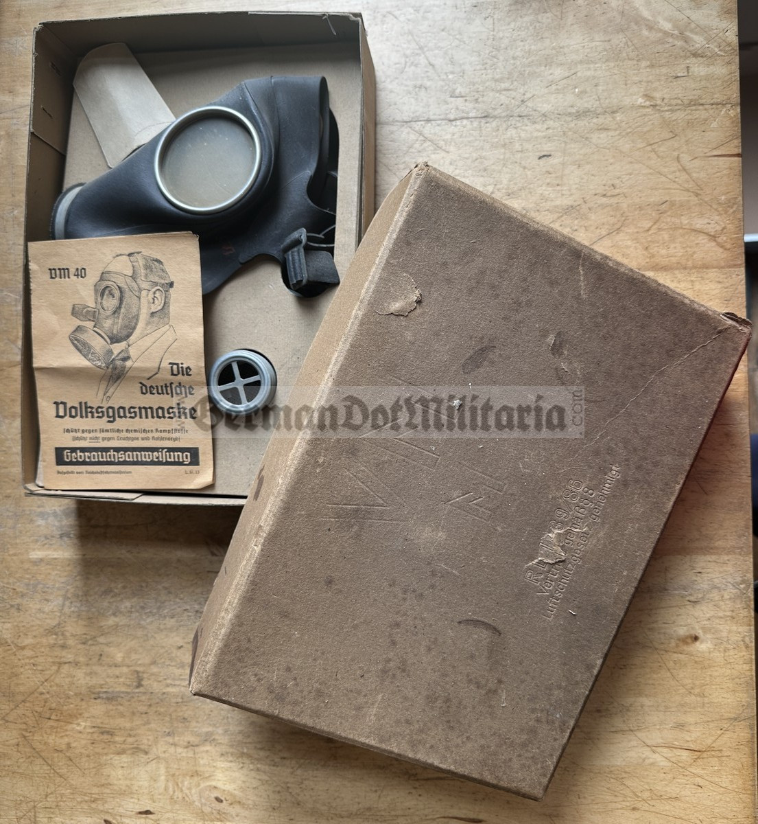 ft005 - WW2 era VM40 German Volksgasmaske gas mask in box and with instructions booklet