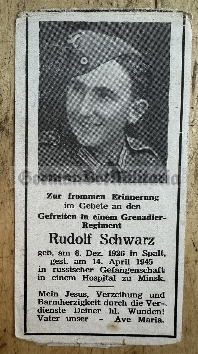 mp079 - German WW2 death card - Wehrmacht Gefreiter - died in Soviet POW camp in Minsk in April 1945